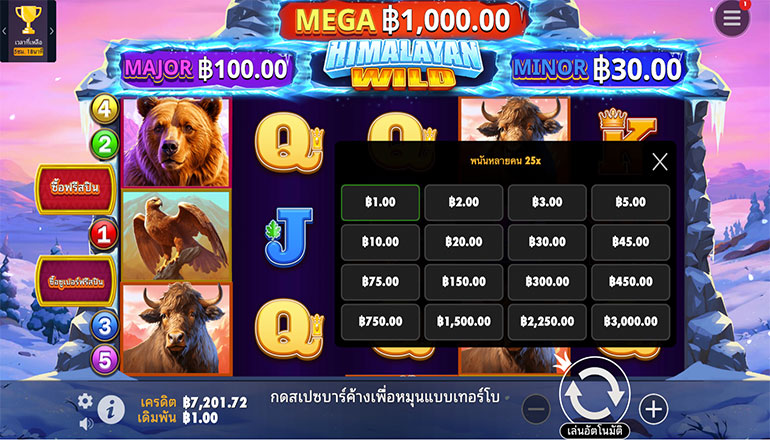 เกมสล็อต Himalayan Wild มีเรทราคาเริ่มต้นเพียง 1.25 บาทต่อรอบ และสามารถปรับเพิ่มได้สูงสุดถึง 3,000 บาท โดยเป็นการกำหนดเงินเดิมพันผ่านมูลค่าของเหรียญอย่างละเอียด ผู้เล่นสามารถเลือกปรับเรทราคาได้เองตามความต้องการและงบประมาณของแต่ละคน