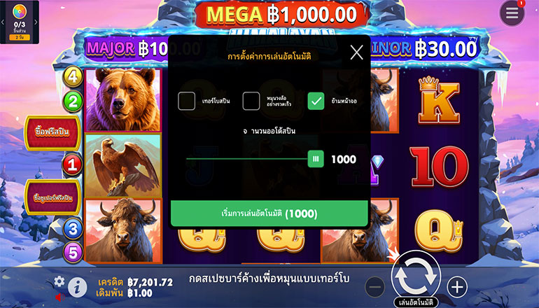 ระบบจะแสดงเมนูให้ผู้เล่นเลือกจำนวนรอบ เริ่มต้นที่ 10 รอบ และสามารถตั้งได้สูงสุดถึง 1,000 รอบ เมื่อกำหนดรอบเรียบร้อยแล้ว ให้กดปุ่ม “เริ่มการเล่นอัตโนมัติ”